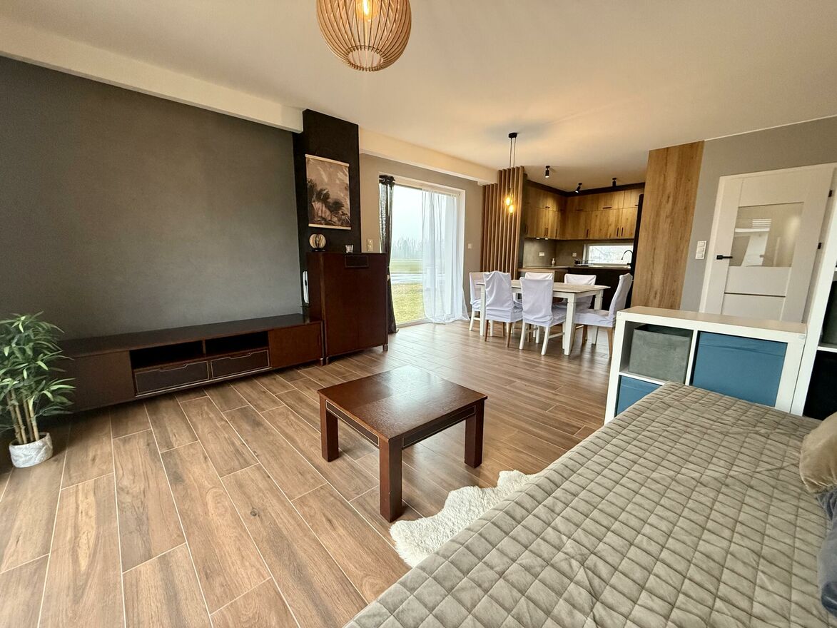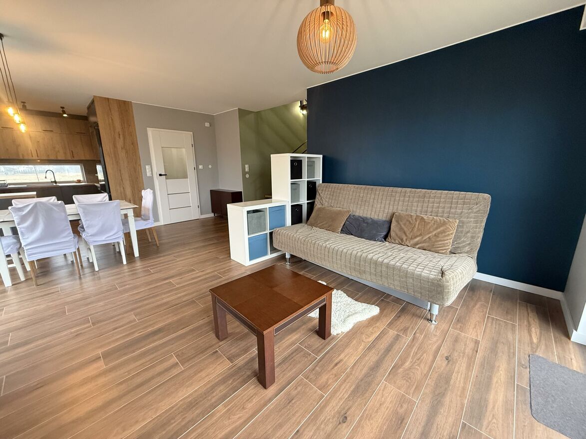 Salon to wygodna, jasna przestrzeń z sofą, stolikiem i szafką RTV, a stół jadalniany naturalnie łączy kuchnię z częścią wypoczynkową.Kuchnia posiada pełną zabudowę oraz sprzęty AGD: lodówkę, zmywarkę, piekarnik, okap i miejsce na ekspres do kawy. Zastosowano praktyczne rozwiązania: narożną szafkę typu "nerka" oraz szuflady z cichym domykiem.