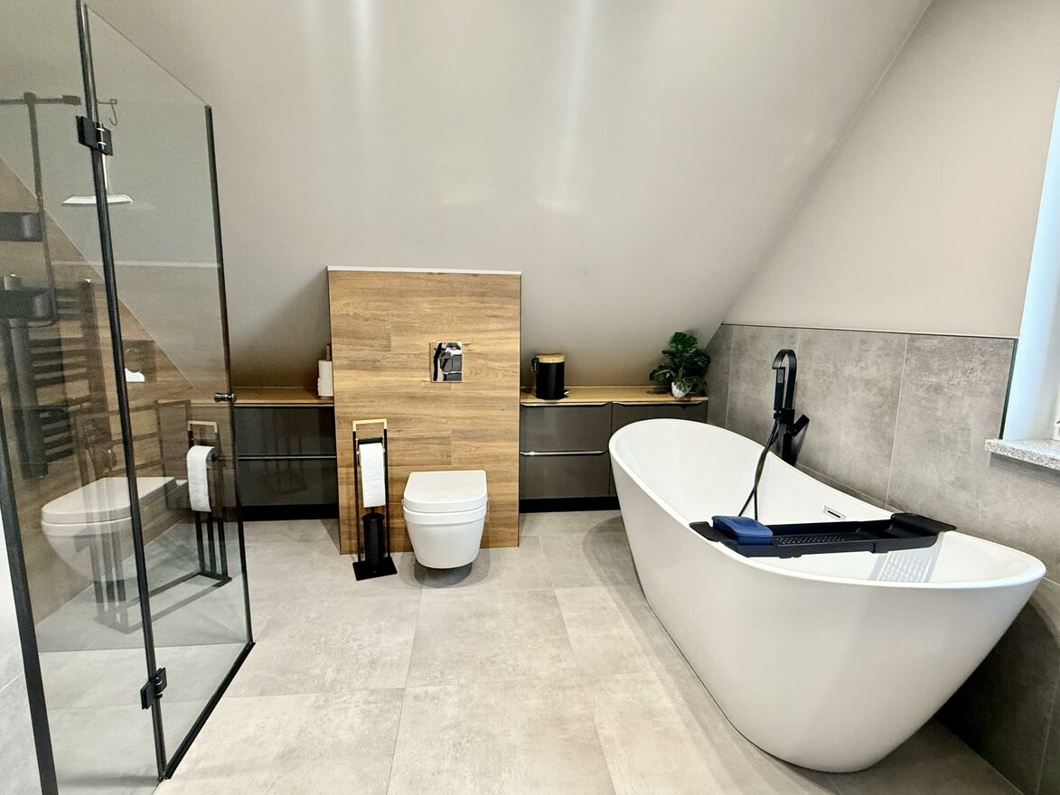 - łazienka z wanną wolnostojącą i kabiną prysznicową,